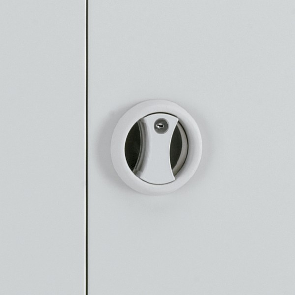 Los armarios con puertas batientes incluyen cerradura circular con sistema de bloqueo en dos puntos, ofreciendo una mayor seguridad para la custodia de documentación y material. En su interior, disponen de estantes metálicos regulables, montados sobre soportes de chapa, que permiten una organización flexible del espacio.