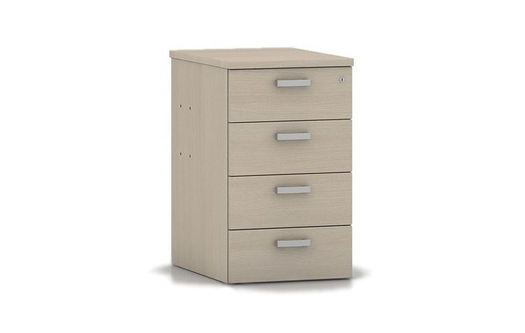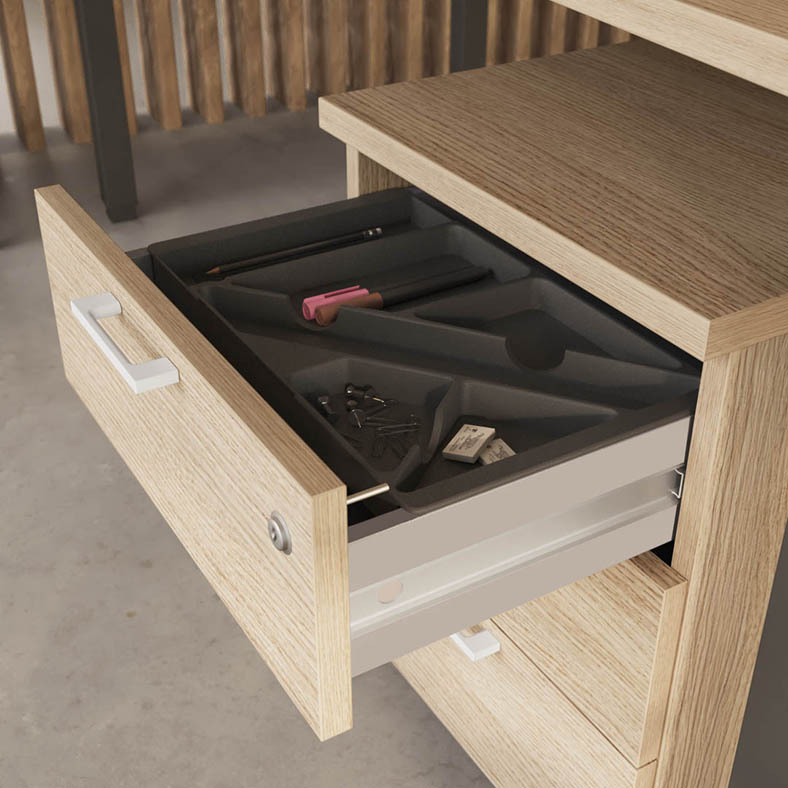 Las cajoneras pueden configurarse con distintos tipos de cajones y gamas interiores (alta, básica o madera), equipados con guías telescópicas de rodamiento a bolas, extracción parcial o total según modelo y sistema antivuelco. El cierre centralizado con cerradura y llaves articuladas asegura la protección del contenido. El cajón archivo incluye bastidor metálico regulable para carpetas DIN A4, folio o folio extendido.
