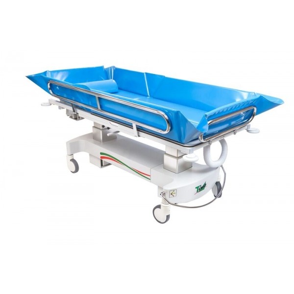 La estructura de la camilla de ducha está hecha de tubos de acero, con ruedas con freno centralizado de 125 mm con cubierta de ABS. Acabado con recubrimiento de polvos epoxi, con protección contra la corrosión. 1650x800x500/900 Mmmm