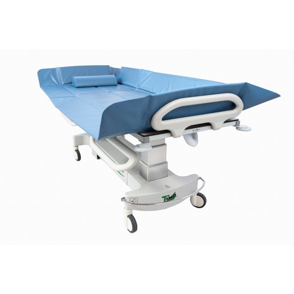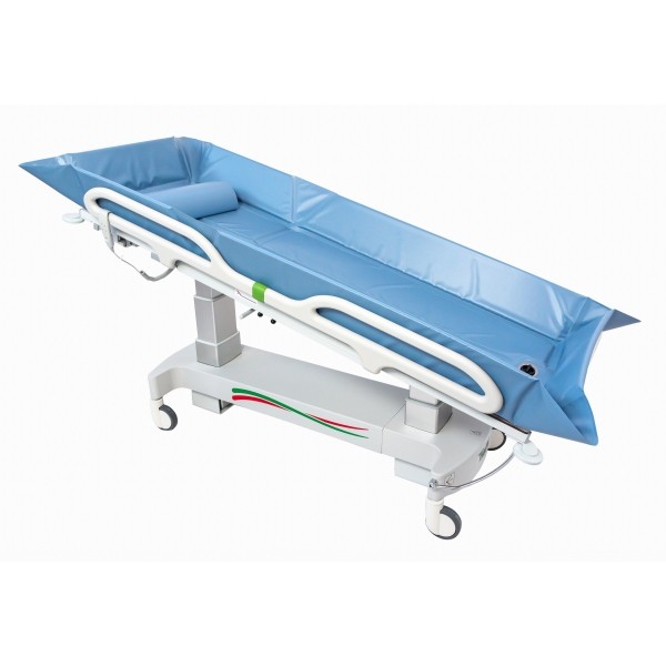 La estructura de la camilla de ducha está hecha de tubos de acero, con ruedas con freno centralizado de 125 mm con cubierta de ABS. Acabado con recubrimiento de polvos epoxi, con protección contra la corrosión. 2050x800x510/910 mmm.