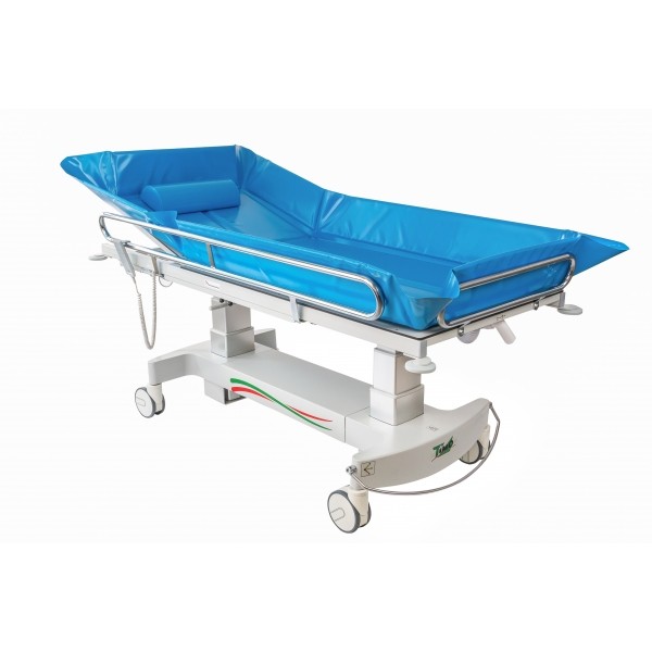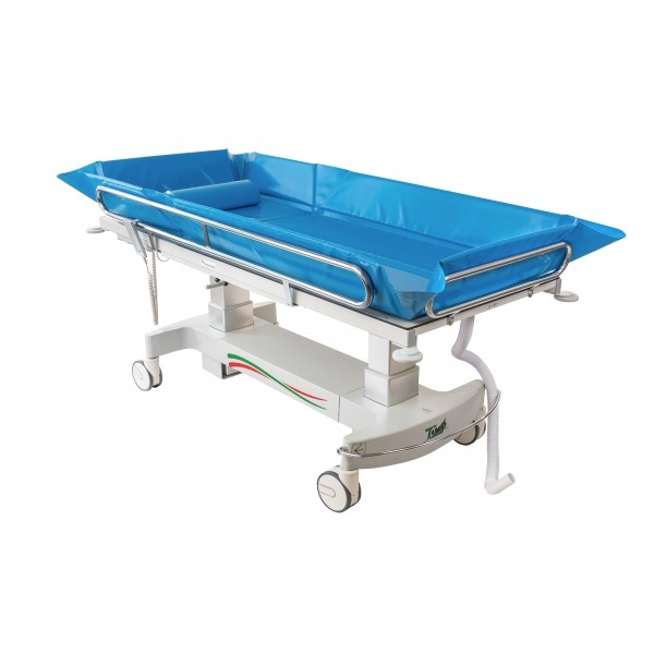 La estructura de la camilla de ducha es de tubos de acero, ruedas gemelas con freno centralizado de 150 mm con cubierta de ABS. Acabado con recubrimiento de polvos epoxi, con protección contra la corrosión. 2050x940x510/910 mmm