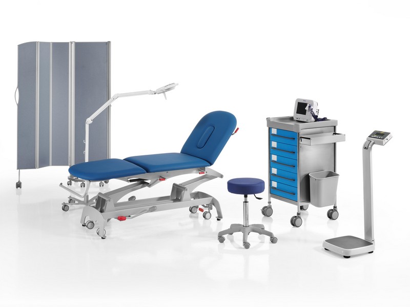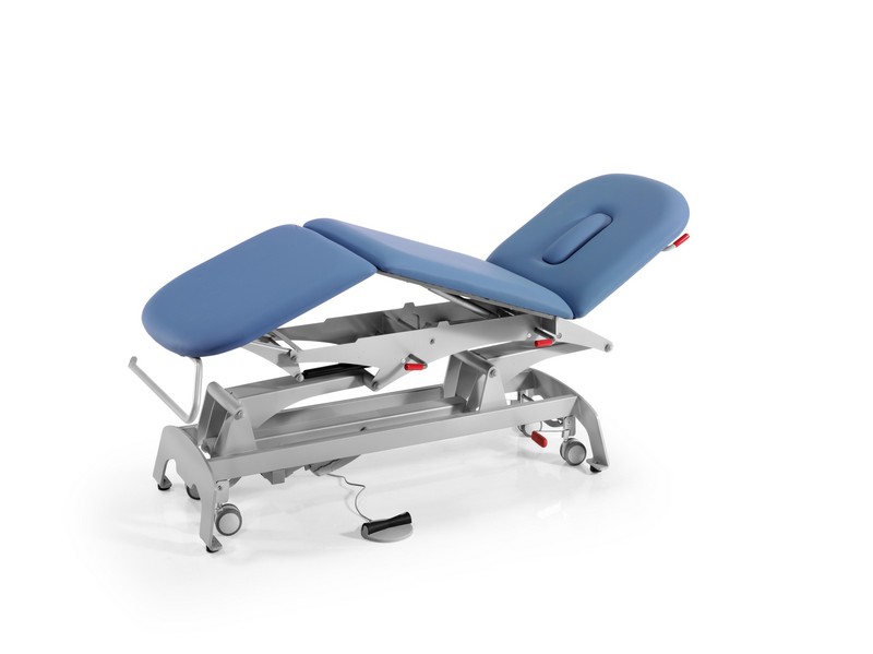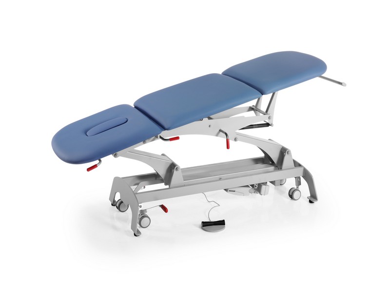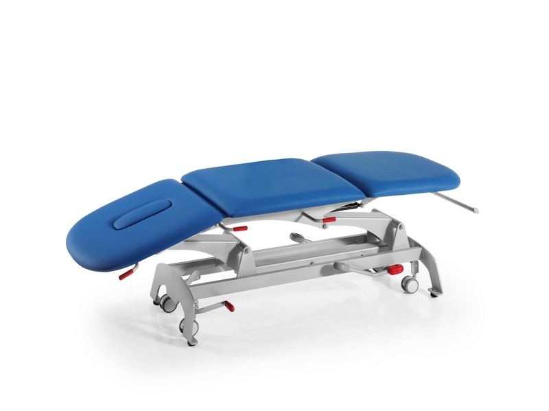 Mesa de tratamiento con cabecero regulable por resorte de gas, sistema de rodadura centralizado, elevación hidráulica o eléctrica y lecho de tres secciones independientes, todas operadas por resorte a gas.
