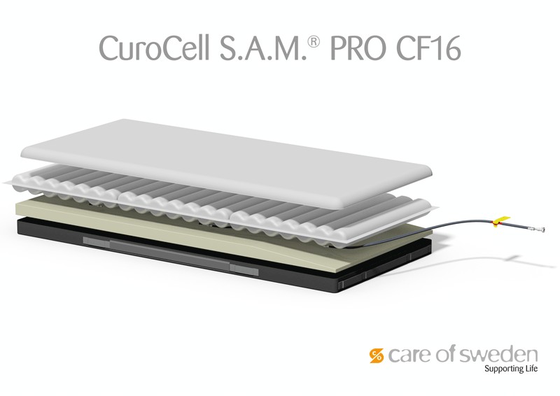 CuroCell S.A.M. PRO CF16 es un colchón de sustitución de baja presión constante que proporciona una gran comodidad y alivio de la presión. Válido para la prevención y el tratamiento de úlceras por presión y cizalla hasta categoría 3, inclusive.