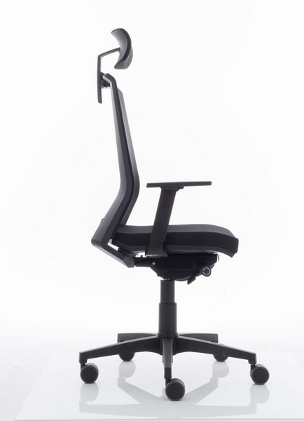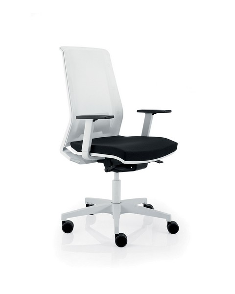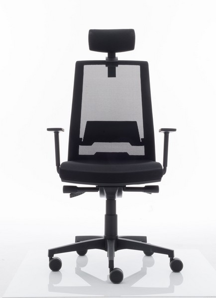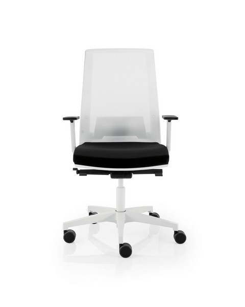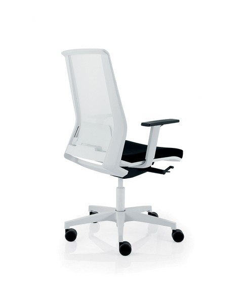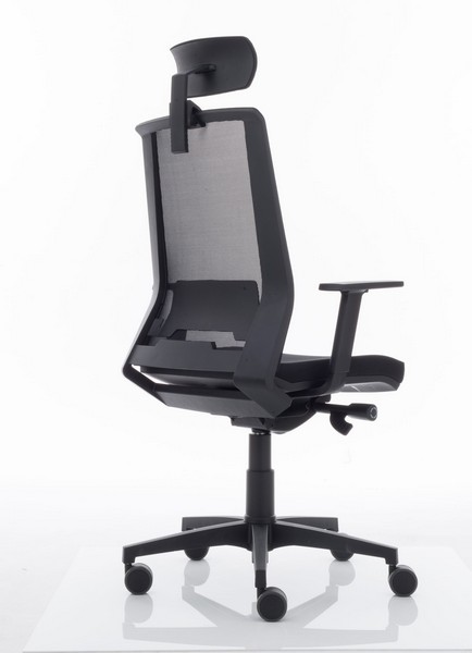 Silla con respaldo tapizado en malla transpirable sobre marco perimetral de polipropileno inyectado tensada sobre respaldo exterior de polipropileno reforzado con fibra de vidrio