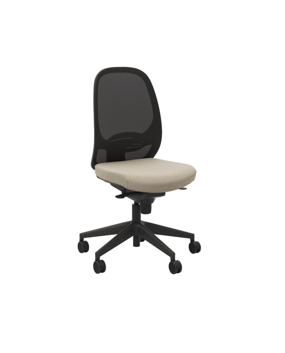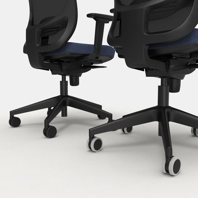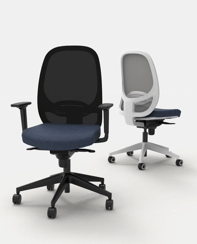 Dispone de mecanismo sincronizado, disponible en versión estándar con 4 posiciones de bloqueo o en versión autopesante con 5 posiciones, ambas con sistema anti-retorno. La reclinación coordinada de respaldo y asiento alcanza los 20º, adaptándose al movimiento natural del cuerpo. El asiento está tapizado con espuma de poliuretano de alta densidad, incorpora regulación en altura mediante pistón de gas y desplazamiento horizontal (trasla) de 5 cm, permitiendo un ajuste preciso de la profundidad.