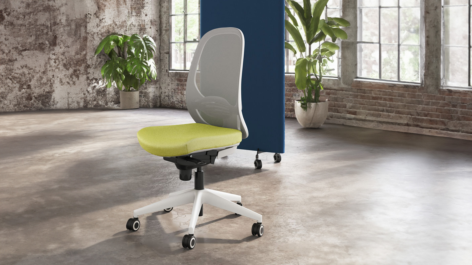 La silla puede configurarse con brazos regulables 1D, 2D o 3D, con ajustes en altura, profundidad, giro y anchura según modelo. La base de cinco radios está fabricada en poliamida reforzada con fibra de vidrio e incorpora ruedas adecuadas para distintos tipos de suelo.