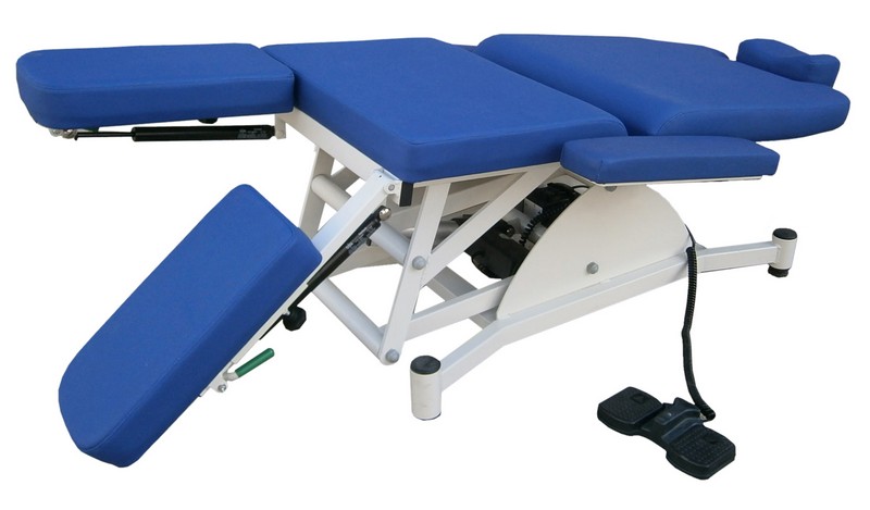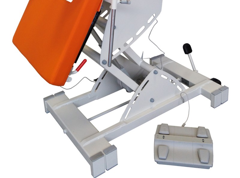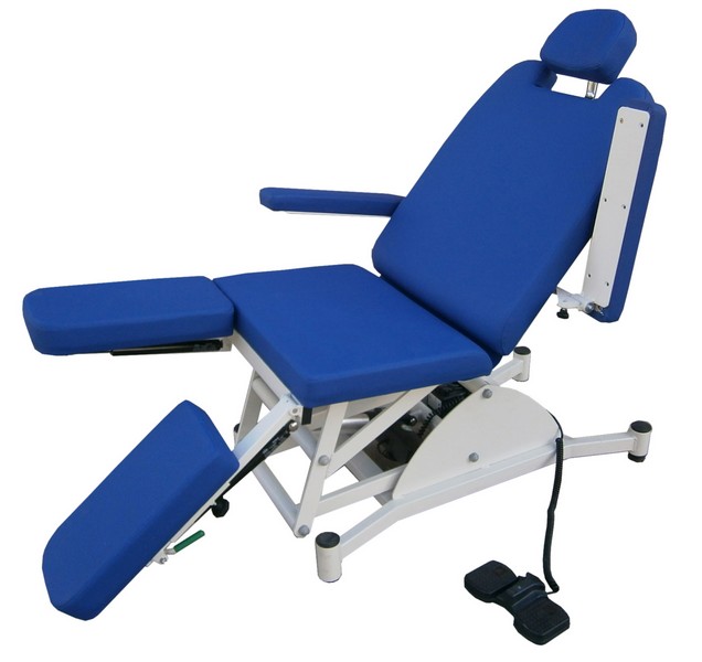 Sillón elevable de podología, para acomodo y posicionamiento de pacientes. Estructura de gran robustez y durabilidad en acero pintado al horno en EPOXI-POLIESTER. Respaldos abatibles por cilindros de gas en palanca bilateral. Reposapiernas PARTIDO abatibles por cilindros de gas independientes en palancas laterales, y extensibles por sistema de guía con maneta.