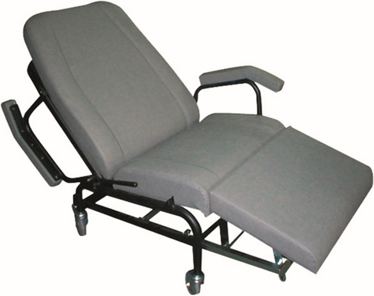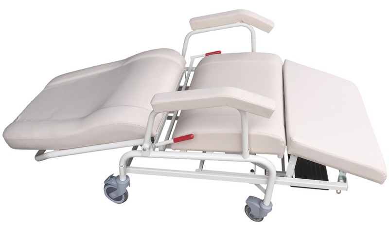 Respaldo abatible por cilindro de gas con Trendelenburg. Reposabrazos abatibles, gancho para bolsa de orina. Reposapiernas escamoteable bajo asiento.